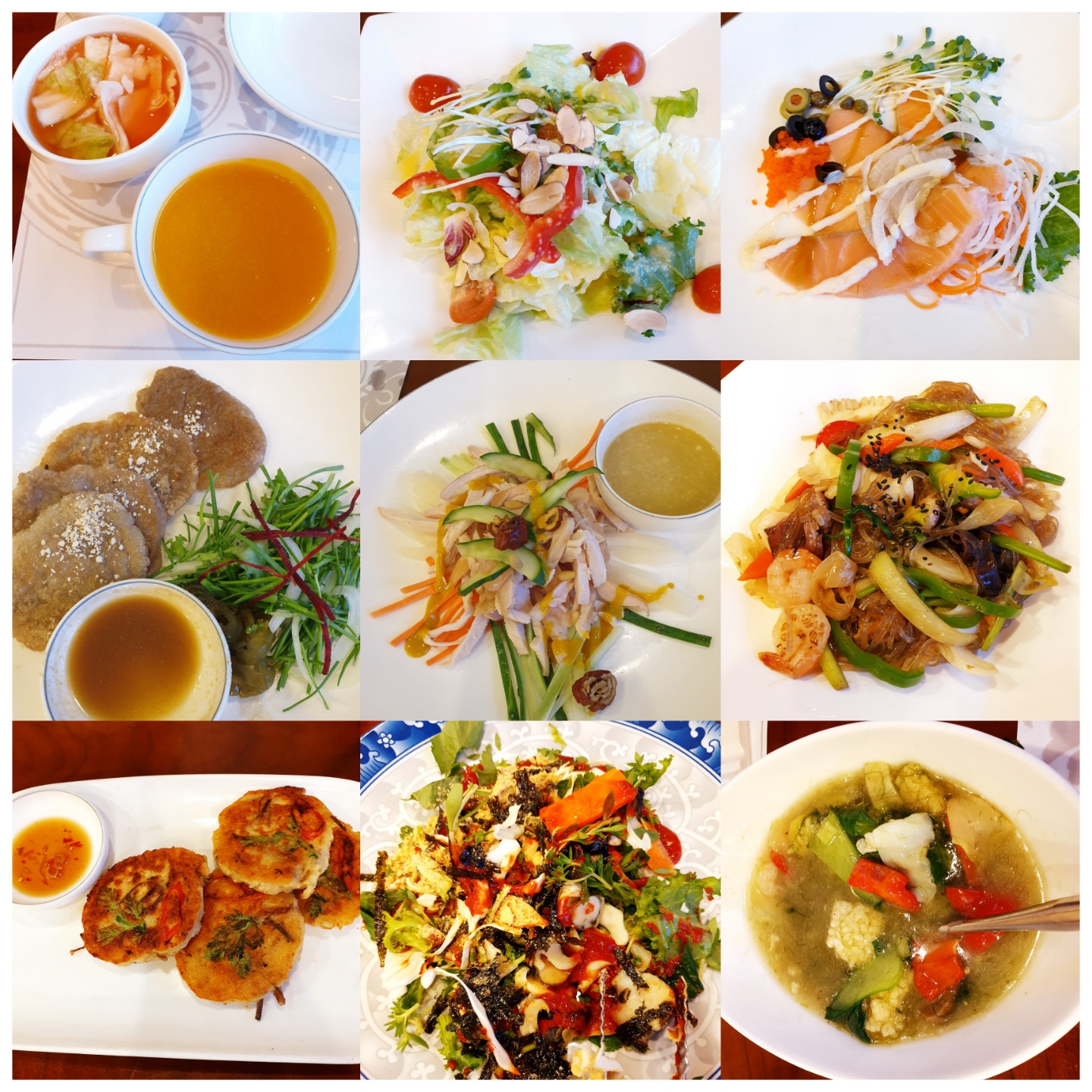 물김치와 죽, 샐러드, 훈제연어요리, 안심찹쌀구이, 닭가슴살 새우 냉채, 해물 궁중잡채, 녹두전, 참소라 무침, 해물 누룽지탕이 차례대로 나오고 음식이 다 나오고 나면 갈비찜과 6개의 반찬, 잡곡밥이 나온다. 음식은 대체적으로 정갈하고 깔끔하게 나오는데 사람에 따라 간이 좀 쎄다고 느낄 수도 있다.
